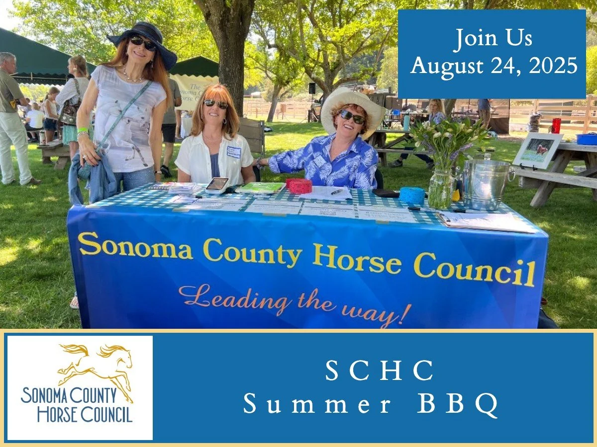 Note: The Sonoma County Horse Council's General Meeting will take place at 11:00 AM, prior to the Summer BBQ. We encourage all members to attend and contribute to the continued success and growth of our equestrian community.